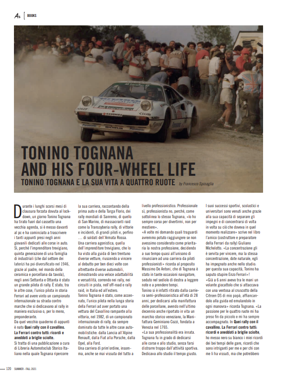 Negli anni Settanta e Ottanta Antonio detto "Tonino" Tognana è stato un grande pilota di rally. È stato, tra le altre cose, l’unico pilota in storia Ferrari ad avere vinto un campionato internazionale su strada contro marche che si dedicavano al rally in maniera esclusiva o, per lo meno, preponderante. Così, da un vecchio quaderno di appunti è nato il libro "Quei rally con il cavallino. La Ferrari contro tutti: ricordi e aneddoti a briglie sciolte".
