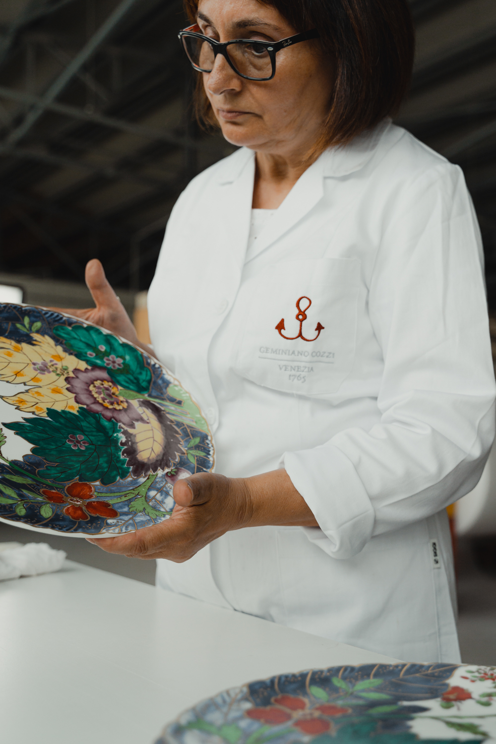Il processo di selezione è stato intenso e accurato. Sono state così fotografate ed esaminate tutte le ancore dipinte presenti sotto i piatti storici: ciascuna con le sue irregolarità raccontava il lavoro artigianale che si celava dietro la produzione. Tra tutte le opzioni, una si è distinta in modo particolare: quella d’oro che Cozzi utilizzava quando realizzava i servizi per i dogi. Sembrava che tra le sue curve si potesse vedere riflesso tutto ciò che si voleva esprimere attraverso il marchio: le origini, la cura, la perseveranza, l’unicità.