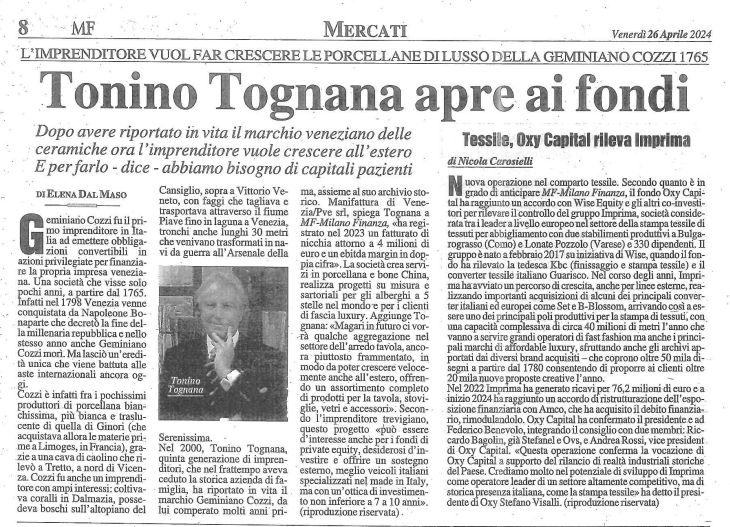Antonio Tognana parla su Milano Finanza. Dopo aver riportato in vita il marchio veneziano delle ceramiche ora l'imprenditore vuole crescere all'estero. E per farlo - dice - abbiamo bisogno di capitali pazienti.