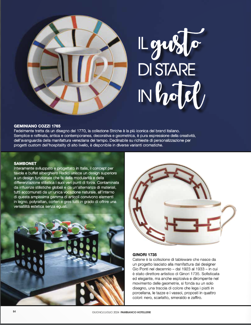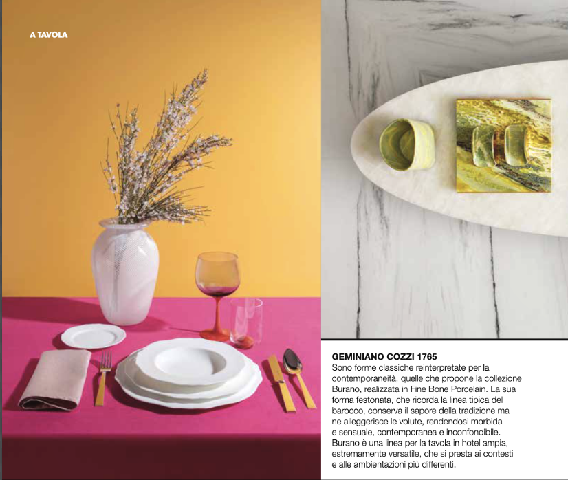 Geminiano Cozzi è presente nei due redazionali di prodotto, Striche multicolor e Burano, pubblicati su Pambianco Hotellerie.