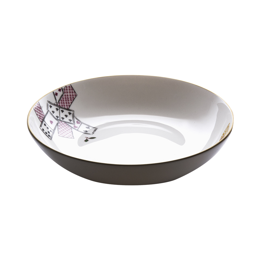 Il piatto fondo cm 20,5 Carte da Zogo interpreta la profondità della convivialità veneziana, tra zuppe e lunghe partite a carte. In bone china dal fondo bianco, le carte a semi rossi e neri e le farfalle colorate si disegnano con freschezza e fantasia, riflettendo lo spirito libero e inclusivo dei salotti d'epoca. Un oggetto che arricchisce ogni pasto con la storia di una Venezia vivace, elegante e sempre pronta al divertimento.