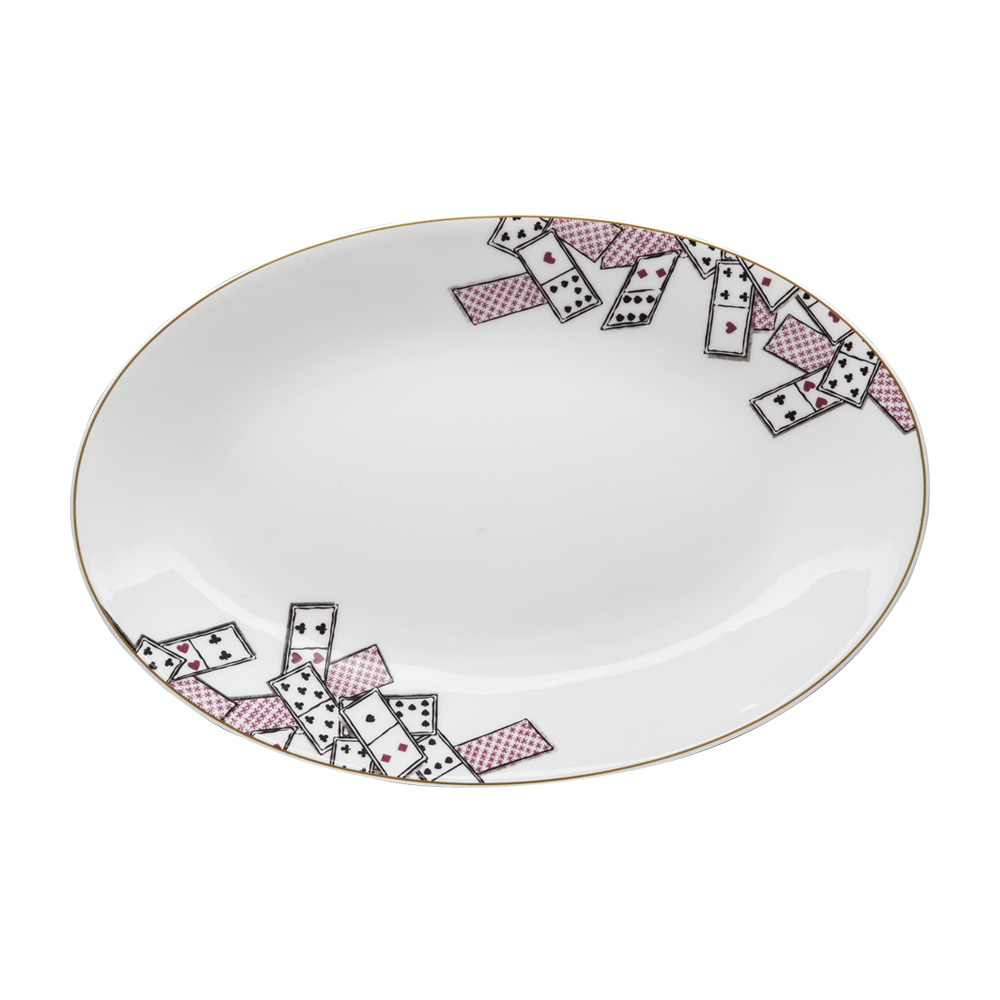 Il piatto ovale cm 26 Carte da Zogo racconta il fascino del salotto veneziano, con la sua forma compatta e la decorazione giocosa di carte,.La bone china bianca dona luce e calore, rievocando l'eclettico ambiente in cui borghesi e nobili si mescolavano in libertà tra storie e partite a carte. Perfetto per antipasti, porta in tavola l'audacia di una collezione unica.