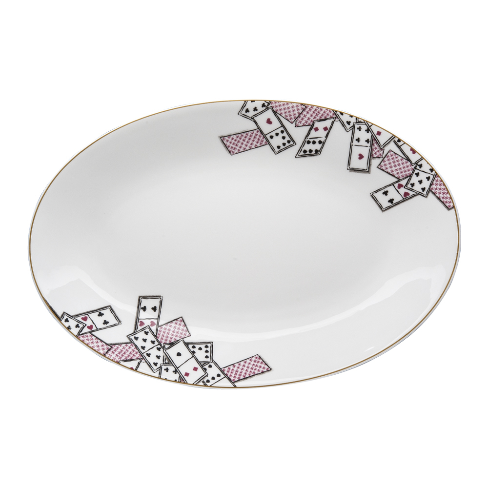 Il piatto ovale cm 37 Carte da Zogo è dedicato ai momenti di grande convivialità, sapientemente resi con la vitalità delle carte che abitano la bone china bianca. Forme generose e linee essenziali creano il supporto perfetto per piatti centrali o buffet, mentre il decoro esprime una tavola eclettica che unisce storia, gioco e un'immancabile nota di leggerezza.