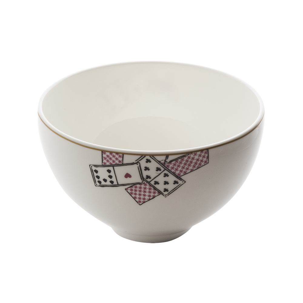 Il bolo con piede cm 14 Carte da Zogo è lavorato in bone china, con decoro distintivo: le superfici presentano carte da gioco stilizzate, rosse e nere, vero marchio di fabbrica della linea. Ideale come coppetta per dessert o antipasti, esalta con carattere il tema ludico e la pulizia delle forme, offrendo colore e personalità alla tavola moderna.