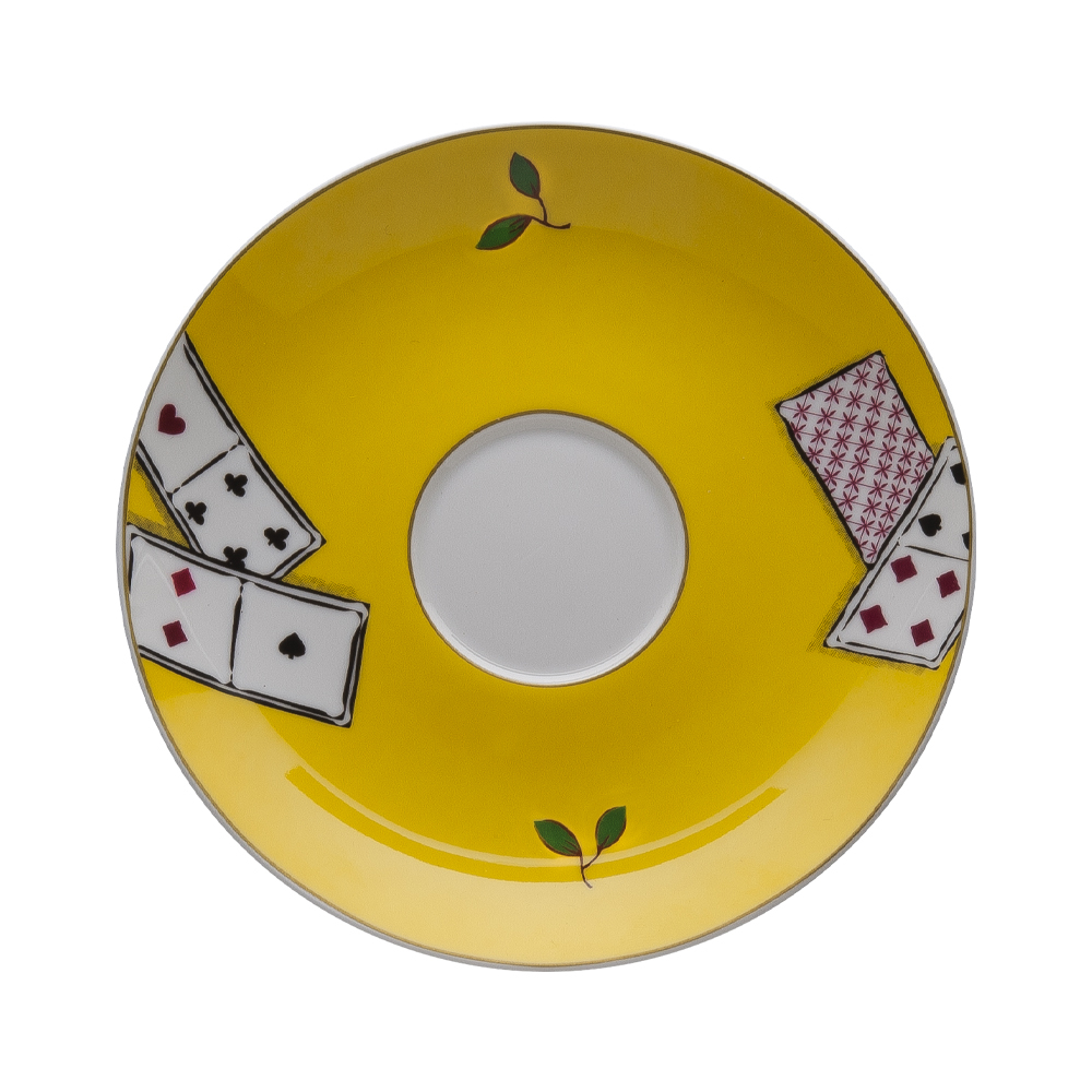 Il piattino per tazza tè e cappuccino cm 15 Carte da Zogo, realizzato in bone china, riprende fedelmente la decorazione identificativa della linea, con foglie verdi e carte da gioco rosse e nere su fondo giallo. Ogni colazione o tea time si collega idealmente alla dimensione sociale della Venezia storica, aggiungendo un accento contemporaneo e creativo al rito quotidiano.