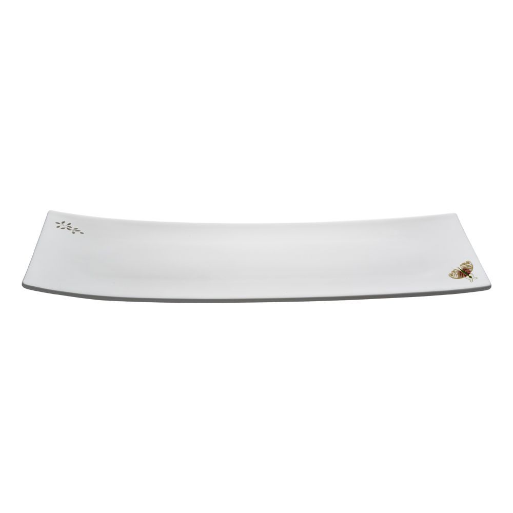 Il vassoio rettangolare cm 35 Carte da Zogo mette in scena la convivialità con una superficie ampia e luminosa, realizzata in bone china. La decorazione si concentra sulle farfalle e alcune foglie verdi. Lungo e scenografico, valorizza crudité, pasticceria o frutta, trasmettendo energia e charme delle serate veneziane dedicate al piacere dello stare insieme.