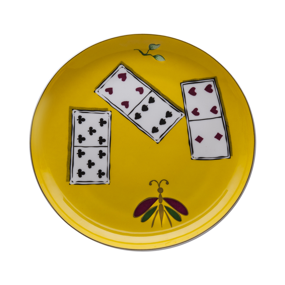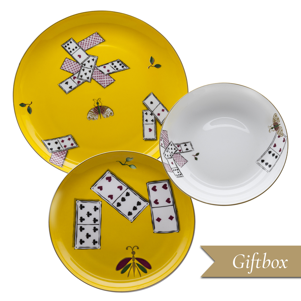 Il set 3 pezzi in Giftbox Carte da Zogo racchiude l'essenza narrativa e decorativa della collezione, presentando tre piatti, piano, fondo e dessert, in raffinata bone china. Due dei tre pezzi mostrano il caratteristico fondo giallo caldo, vivido e luminoso, su cui spiccano carte da gioco a semi rossi e neri distribuite in modo giocoso ma armonico. Tra le carte compaiono anche farfalle multicolori in volo e sofisticate foglie verdi stilizzate, elementi che aggiungono dinamismo ed eleganza al servizio. L'insieme trasmette un'atmosfera di libertà, ironia e accoglienza, reinterpretando lo spirito dei salotti veneziani settecenteschi senza nessun eccesso, ma con grande personalità e originalità.