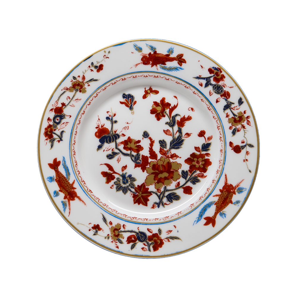 Un piattino pane e burro raffinato, che trasporta la tavola nella Venezia settecentesca, quando il fascino dell'Oriente arrivava attraverso la Via della Seta. In pregiata bone china, è decorato con dettagli floreali e motivi Imari tipici della collezione Chinesi Fiori Finiti. Ogni elemento richiama artigianalità e fortuna, per colazioni o ricevimenti di classe, evocando atmosfere di mistero, lusso e storia autenticamente veneziana.