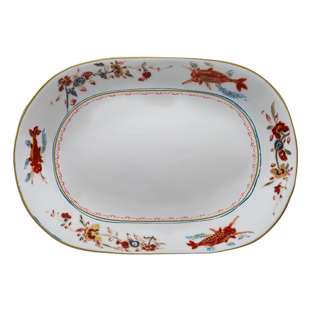 Il piatto ovale Chinesi Fiori Finiti da 45 cm celebra le grandi occasioni, offrendo uno spazio elegante in fine porcelain estremamente brillante. I decori Imari e le carpe Koi, simbolo benaugurante, rendono la presentazione delle pietanze unica e suggestiva. Perfetto come vassoio centrale o per portate da condividere, fonde tradizione artigianale veneziana e ispirazione orientale in un racconto di accoglienza, lusso autentico e convivialità.