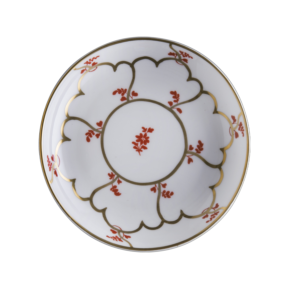 Piccolo capolavoro di eleganza, il piattino pane e burro Feston e Cadena Rosso In bone china è decorato con maglie lobate in oro zecchino e tocchi di rosso intenso. La trama preziosa rievoca i delicati intrecci delle conversazioni veneziane nei caffè storici. Perfetto per accompagnare il pane e burro, aggiunge alla tavola un senso di bellezza raffinata e romanticismo. Ogni dettaglio esprime la tradizione Geminiano Cozzi 1765, trasformando anche il più semplice gesto in un rituale di stile e convivialità.