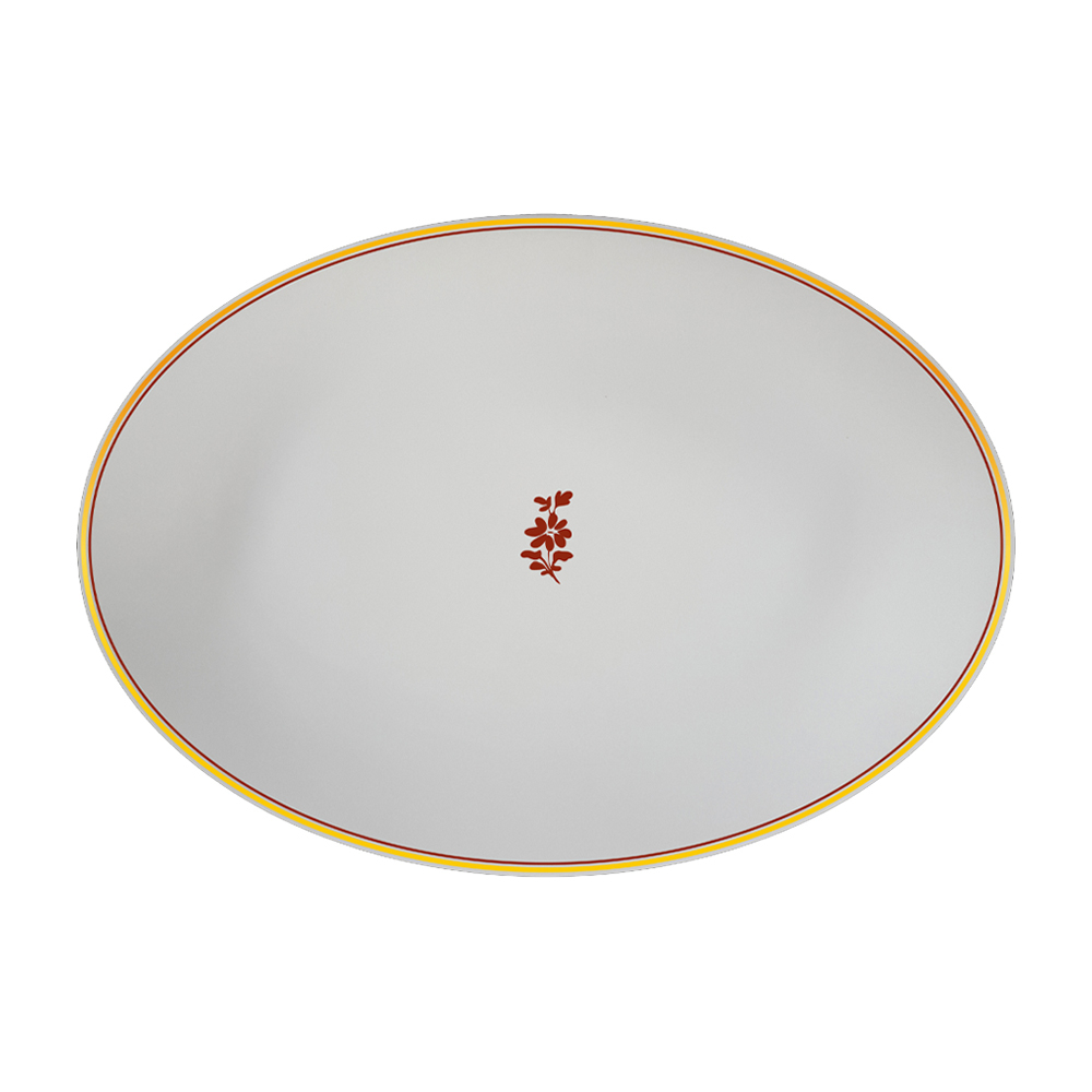 Questo piatto ovale da 26 cm, in pregiata bone china, esprime con sobria eleganza il decoro Feston e Cadena Rosso. Un filo in oro zecchino, il controfilo rosso e un delicato fiore centrale arricchiscono il design senza togliere spazio alle pietanze. Perfetto per presentare antipasti o contorni, porta in tavola lo stile raffinato della tradizione veneziana. Firmato Geminiano Cozzi 1765, unisce qualità, raffinatezza e cultura in ogni dettaglio.