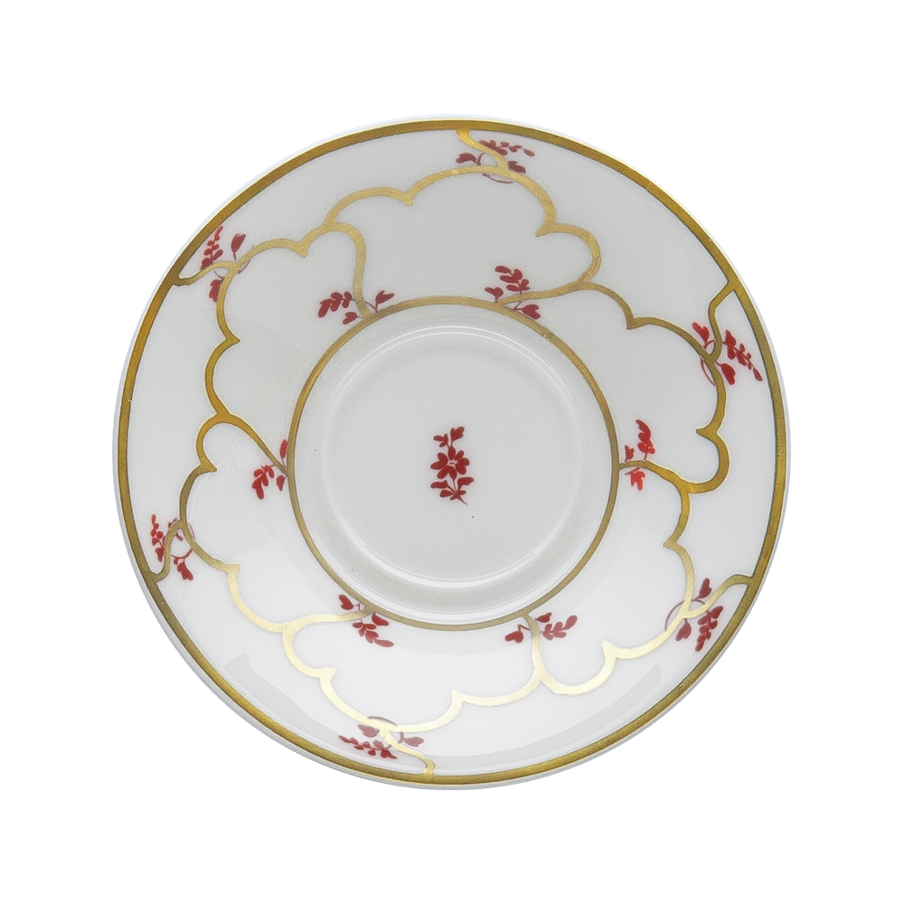 Elegante piattino da 12 cm, pensato per accompagnare unicamente la tazza caffè della collezione. In bone china, è decorato con la celebre rete dorata e inserti rossi, motivo identificativo di Feston e Cadena Rosso. Le sagome di glicine e i dettagli a maglia evocano raffinate conversazioni nei caffè veneziani. Perfetto per presentare la tazzina con stile e precisione, racchiude in sé l'essenza del design firmato Geminiano Cozzi 1765, valorizzando ogni pausa con un tocco di storia e romanticismo.