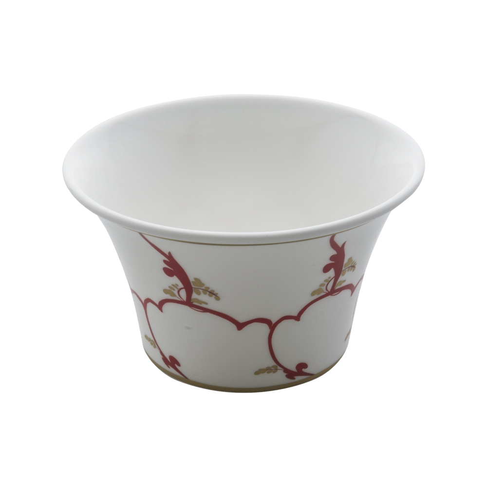 La zuccheriera Feston e Cadena Rosso da 200 cc unisce tradizione e creatività veneziana. In preziosa bone china, è decorata con reticolo oro zecchino, accenti rossi e motivi di glicine, simbolo di accoglienza e longevità. Il coperchio si integra nel disegno per offrire un insieme armonioso. Ideale per completare il servizio da tè e caffè, racconta la cura Geminiano Cozzi 1765 per ogni particolare, trasformando anche il dettaglio più piccolo in espressione di stile raffinato.