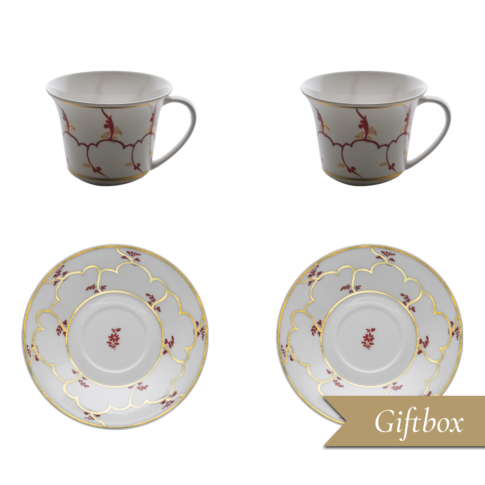 Il set tè Feston e Cadena Rosso racchiude due tazze da tè e due piattini in bone china, ornati dalla preziosa maglia dorata intrecciata ai motivi rossi e di glicine. Confezionato in una raffinata giftbox, rende speciale ogni momento di condivisione. È il frutto della cultura veneziana, dove il rito del tè era espressione di arte e relazione sociale. Un dono elegante e completo, destinato a chi ricerca raffinata ospitalità e tradizione autentica.