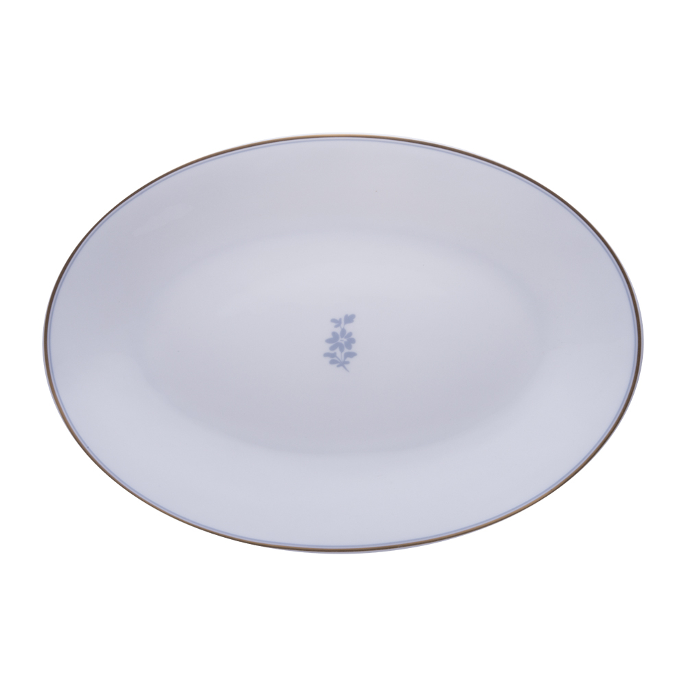 Questo piatto ovale 32 cm, parte della collezione Feston e Cadena Azzurro, spicca per il bordo decorato da intervalli dorati e azzurri in dialogo armonioso. In bone china brillante, presenta al centro la tipica foglia di glicine blu, simbolo di presenze discrete ma preziose nella tradizione veneziana. Ideale per portate da condividere, dona alla tavola freschezza e carattere, mantenendo la raffinatezza essenziale della linea Geminiano Cozzi 1765.
