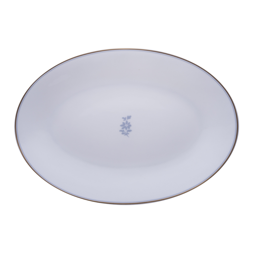 Il piatto ovale 37 cm della collezione Feston e Cadena Azzurro esalta grandi portate e composizioni scenografiche. Il bordo decorato con dettagli in oro e azzurro crea un effetto luminoso e solenne, perfettamente equilibrato dalla foglia di glicine blu al centro sul fondo bianco. La bone china garantisce prestigio e durata, mentre il design racconta la storia di Venezia e del gusto d'élite, firmata Geminiano Cozzi 1765.