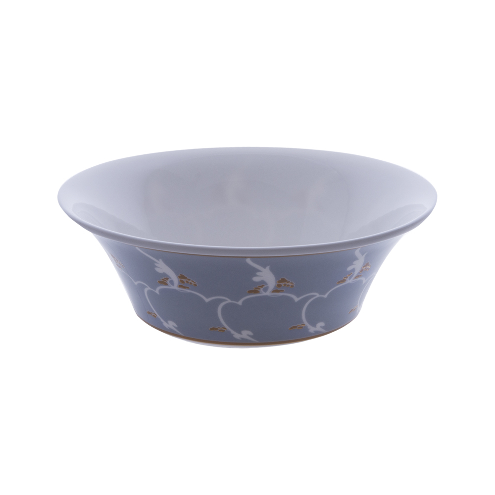 La coppetta da 15 cm della collezione Feston e Cadena Azzurro si distingue per la sua elegante fascia in azzurro chiaro che abbraccia l'esterno della forma svasata. Su questo fondo luminoso si distribuiscono motivi stilizzati di foglie bianche e piccoli dettagli in oro zecchino, creando un decoro armonioso e arioso unico per questa linea. L'interno, completamente bianco, esalta la purezza della bone china e offre la cornice ideale per dessert, frutta o assaggi. Un accessorio di raffinata semplicità firmato Geminiano Cozzi 1765, perfetto per chi ama la poesia sottile e i dettagli della tradizione veneziana.