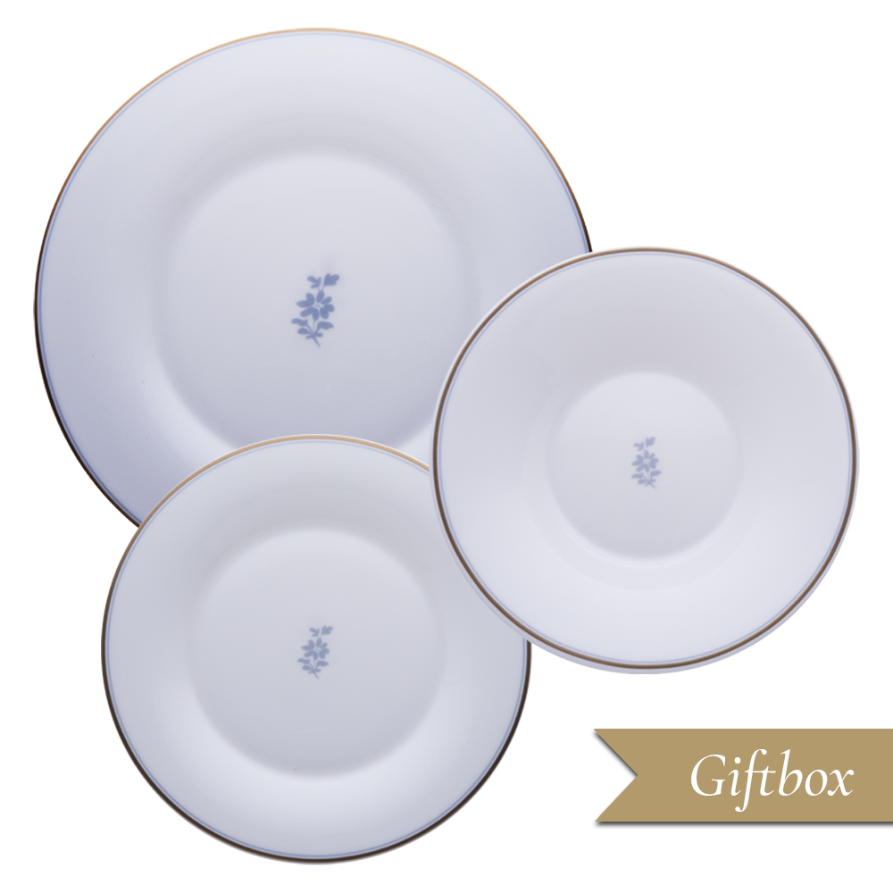 Questo set 3 pezzi della collezione Feston e Cadena Azzurro, in elegante giftbox GCV, comprende piatto piano, fondo e dessert, lavorati in bone china e decorati con la tipica alternanza di motivi oro zecchino, dettagli azzurri e foglie di glicine blu. La confezione valorizza ogni dettaglio, rendendolo perfetto sia come dono prezioso sia per arricchire la propria tavola con stile Geminiano Cozzi 1765.