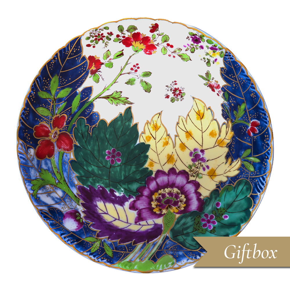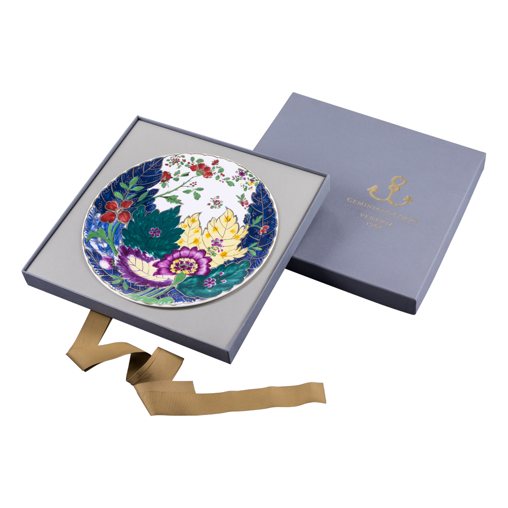 Questo segnaposto da 33 cm della collezione Foglie de Tabaco è presentato in elegante giftbox GCV. In pregiata bone china, è decorato con la celebre composizione di foglie di tabacco multicolore, peonie viola, garofani rossi e profili in oro lucente. Ogni dettaglio evoca un giardino fiorito e la grazia delle antiche manifatture europee. Perfetto come regalo raffinato o elemento centrale della mise en place, esprime la ricchezza visiva e la creatività firmata Geminiano Cozzi 1765.