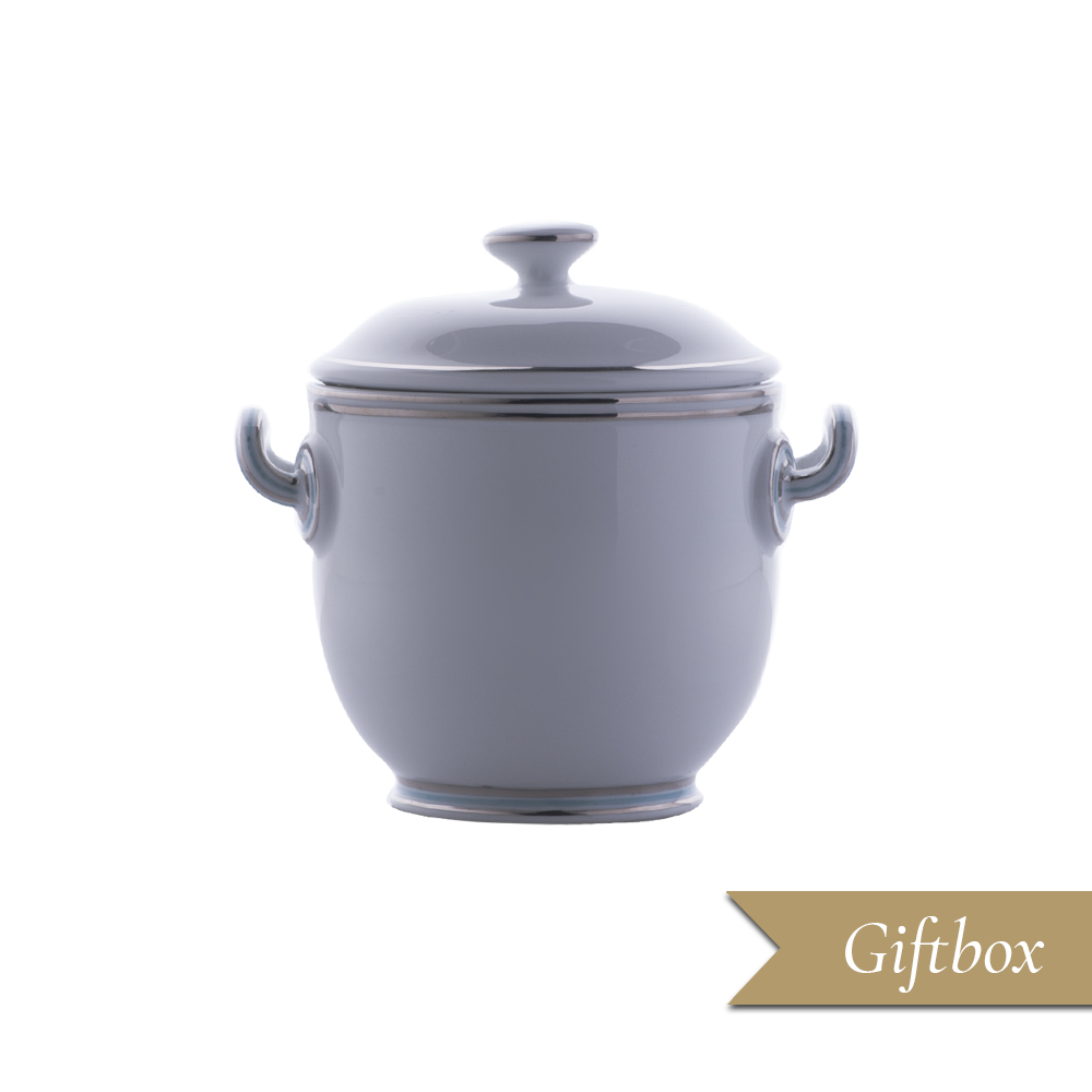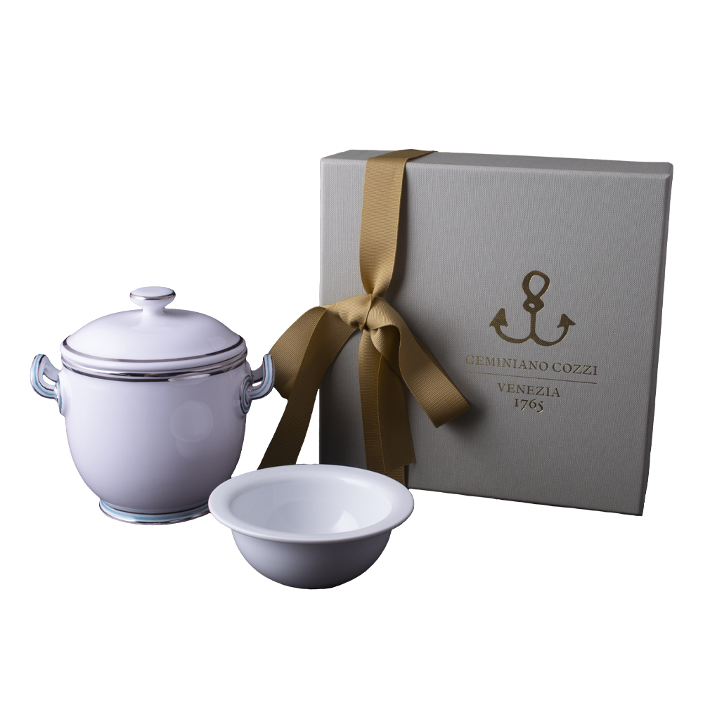 Eleganza sublime e versatilità si uniscono in questo raffinato set da degustazione: il piccolo vaso in porcellana, decorato a mano con sottili fili platino e delicati motivi azzurri, viene presentato insieme a una coppetta caviale coordinata ed esclusiva giftbox Geminiano Cozzi Venezia 1765. Ispirato ai servizi cerimoniali veneziani del Settecento, il vaso riproduce la silhouette storica con manici sagomati, adattata alle esigenze contemporanee di hospitality e presentazione gourmet. Perfetto per la degustazione di caviale, creme raffinate, finger food o piccole delizie, trova spazio sulle tavole di hotel di lusso, ristoranti stellati e come prestigioso regalo aziendale. Il connubio tra tradizione, personalità decorativa e funzionalità ne fa un oggetto iconico, capace di sorprendere e valorizzare ogni occasione speciale.