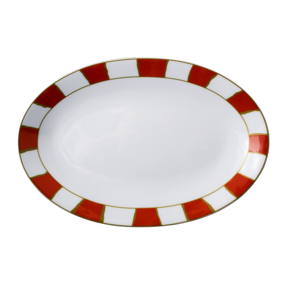 La versione più scenografica del decoro, il piatto ovale 45cm Striche Arancio e Oro In porcellana, regala alla tavola una presenza iconica. Come in un quadro astratto, il candore del centro esalta la radiante fascia arancio, mentre l'oro metal in chiusura impreziosisce il bordo con rara finezza. Massima espressione della collaborazione tra arte e manifattura, è il simbolo della tradizione Cozzi che attraversa il tempo, offrendo originalità e classe alle occasioni più speciali.
