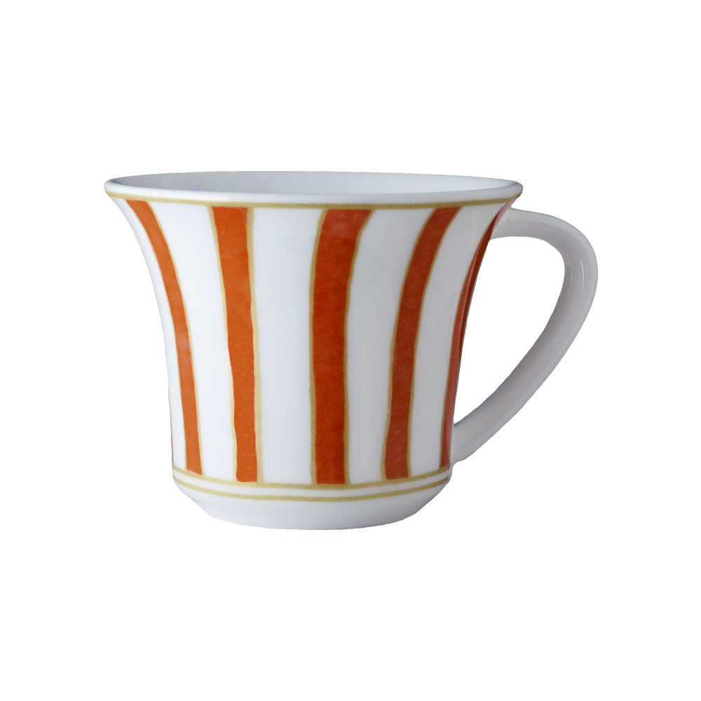 La tazza caffè Striche Arancio e Oro da 110cc è sintesi perfetta di eleganza e innovazione stilistica. Realizzata in bone china, presenta un motivo esclusivo: l'intera superficie esterna è ritmata da fasce verticali arancioni, ciascuna racchiusa fra due sottili linee dorate che ne accompagnano la slanciatura fino al bordo e alla base. Il bianco luminoso tra le strisce crea un contrasto raffinato e dinamico, perfetto per esaltare la ritualità del caffè con un tocco iconico e distintivo ispirato alla grande tradizione Cozzi.