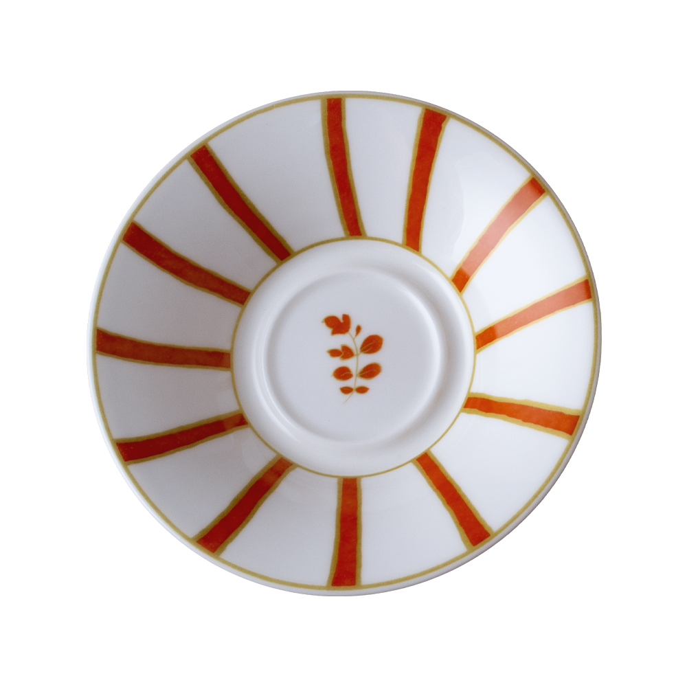 Il piattino per tazza caffè Striche Arancio e Oro da 12cm è un piccolo gioiello di eleganza grafica. In bone china, la superficie è ravvivata da raggi arancio disposti a ventaglio, ciascuno delimitato da sottili filetti dorati che si irradiano dal centro verso il bordo. Nel centro, un delicato ramage floreale arancio aggiunge un dettaglio esclusivo e poetico. Una linea dorata corre per tutto il bordo, valorizzando la luminosità della porcellana e la precisione artigianale. Un complemento raffinato, perfetto per una pausa caffè d'autore.