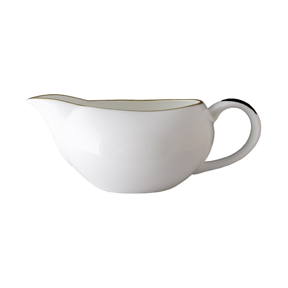La salsiera 350cc Striche Nere e Oro si distingue per la sua raffinatezza sobria: realizzata in impeccabile bone china bianca, presenta come unico vezzo decorativo una delicata linea dorata lungo il bordo superiore e una nera nella parte superiore del manico. Essenziale e versatile, unisce tradizione manifatturiera e attualità di gusto, adattandosi a ogni servizio con classe sottile. Ideale per accompagnare con stile salse, condimenti e intingoli su tavole contemporanee o classiche.