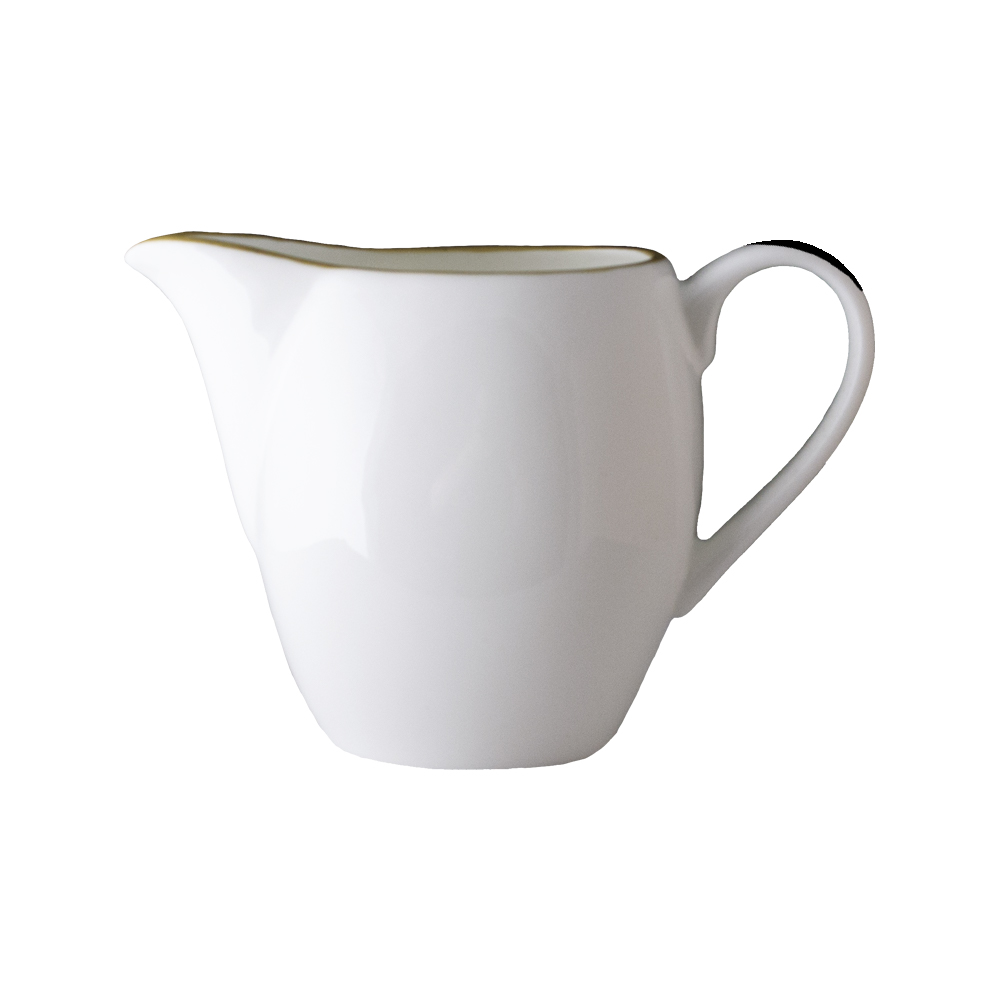 La lattiera 150cc Striche Nere e Oro celebra l'essenzialità raffinata della collezione. In pura bone china bianchissima, si distingue per la totale assenza di decori sul corpo, valorizzata da una sottilissima linea dorata che borda elegantemente l'orlo superiore. La forma ergonomica e l'estrema luminosità materica la rendono perfetta per completare il servizio da tè o colazione con discrezione, classe e uno stile che è pura tradizione Cozzi.