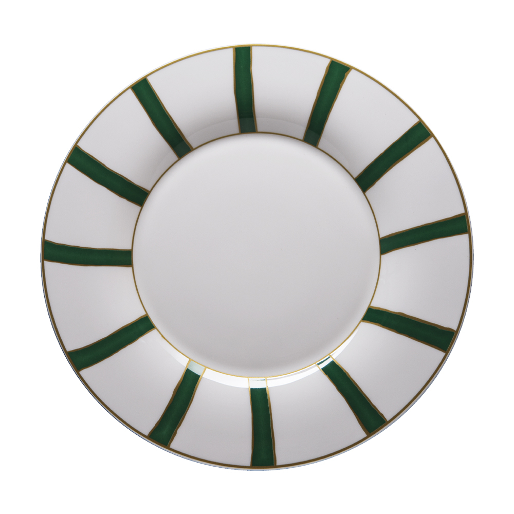 Il piatto piano 28cm Striche Verdi e Oro porta in tavola l'essenza della classicità Geminiano Cozzi. Realizzato in esclusiva bone china, presenta fasce radiali verdi su fondo bianco, armonicamente concluse dal bordo dorato applicato con cura artigianale. Il disegno, ideato già nel 1770, mantiene tutta la sua attualità, offrendo modernità e raffinatezza a ogni portata principale e servizio importante.