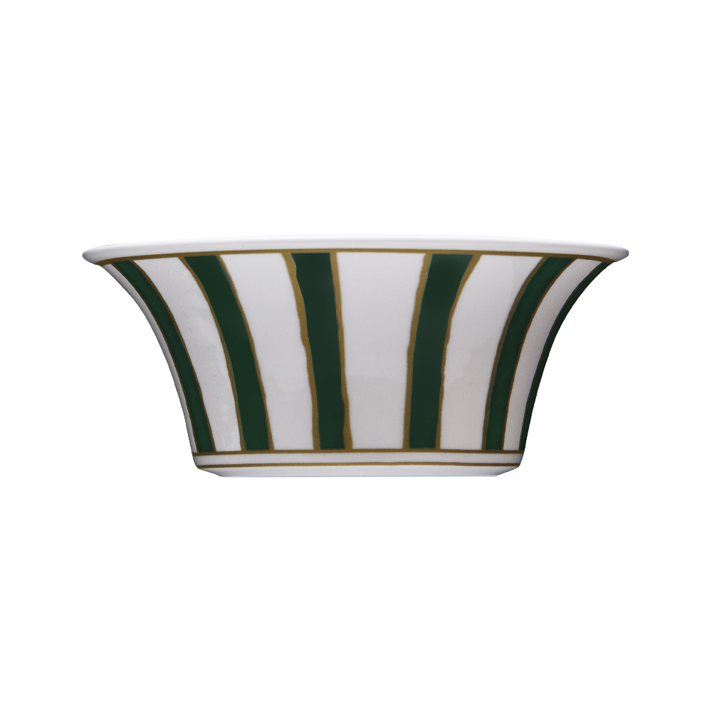 La coppetta 15cm Striche Verdi e Oro è sintesi di praticità e audacia grafica. La superficie in bone china è animata da fasce verdi verticali disposte a raggiera, ciascuna separata da delicati filetti dorati che accentuano lo sviluppo della forma. Perfetta per dolci, antipasti o frutta, trasforma ogni preparazione in un'esperienza estetica, evocando lo stile visionario e il rigore artigianale della scuola Cozzi.
