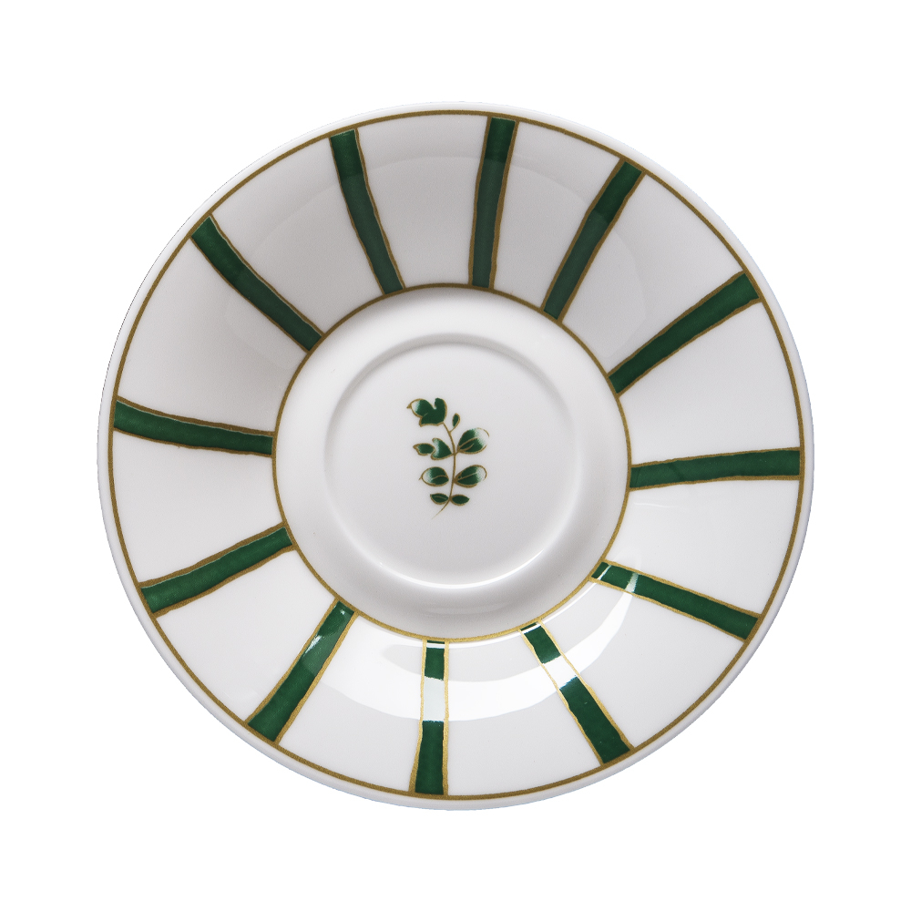 Il piattino da 16cm Striche Verdi e Oro chiude la collezione con una nota di armonia radiale. Raggi verdi a spazi bianchi, delimitati da sottili linee dorate con un un delicato fiore centrale sul fondo, risplendono sulla lucente bone china, donando coerenza e riconoscibilità a ogni servizio. Ideale per completare la tua pausa tè o cappuccino all'insegna di eleganza, arte e purezza tipica della tradizione Geminiano Cozzi.