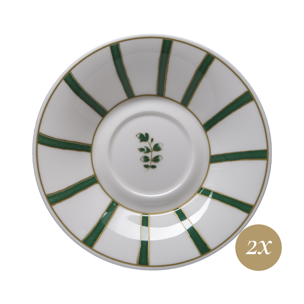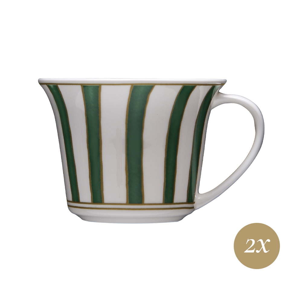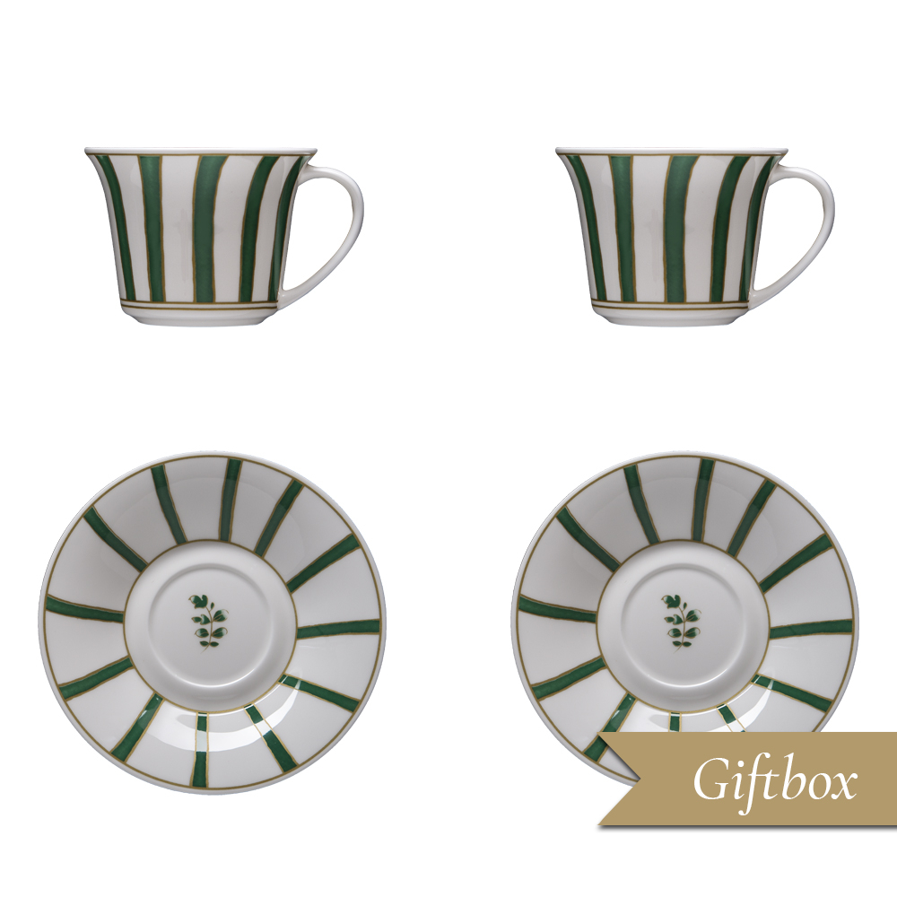 Il set tè 4 pezzi Striche Verdi e Oro, in raffinata giftbox GCV, celebra la migliore tradizione decorativa veneziana. Le due tazze in pura bone china si distinguono per il motivo verticale: fasce verdi, ciascuna racchiusa fra delicati filetti dorati, si succedono graziosamente creando un effetto grafico deciso e luminoso. I due piattini coordinati propongono un decoro a raggiera: le strisce verdi si alternano agli spazi bianchi, sottolineate dal profilo oro e arricchite al centro da un elegante ramage floreale stilizzato verde. Un set pensato per valorizzare ogni rituale del tè, unendo funzionalità, bellezza e la firma della storica creatività Cozzi.