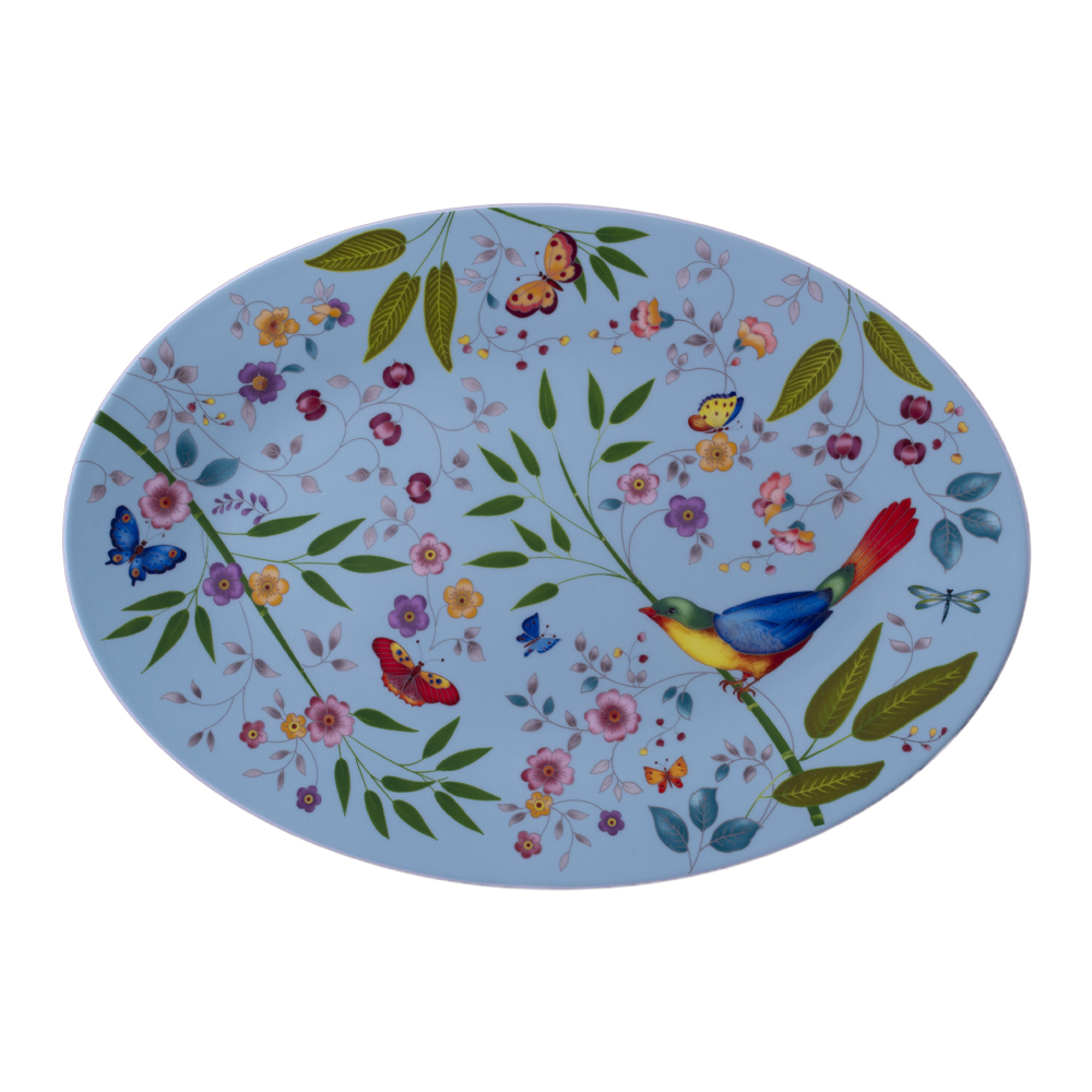 Il piatto ovale da 37 cm della collezione Incanto di Primavera, in bone china con sfondo azzurro chiaro, è pensato per porzioni abbondanti o portate da condividere: la scena naturale decorativa, con rami, fiori, foglie, farfalle e uccellini, trasporta subito in un'atmosfera di gioia e bellezza durante ogni momento conviviale.