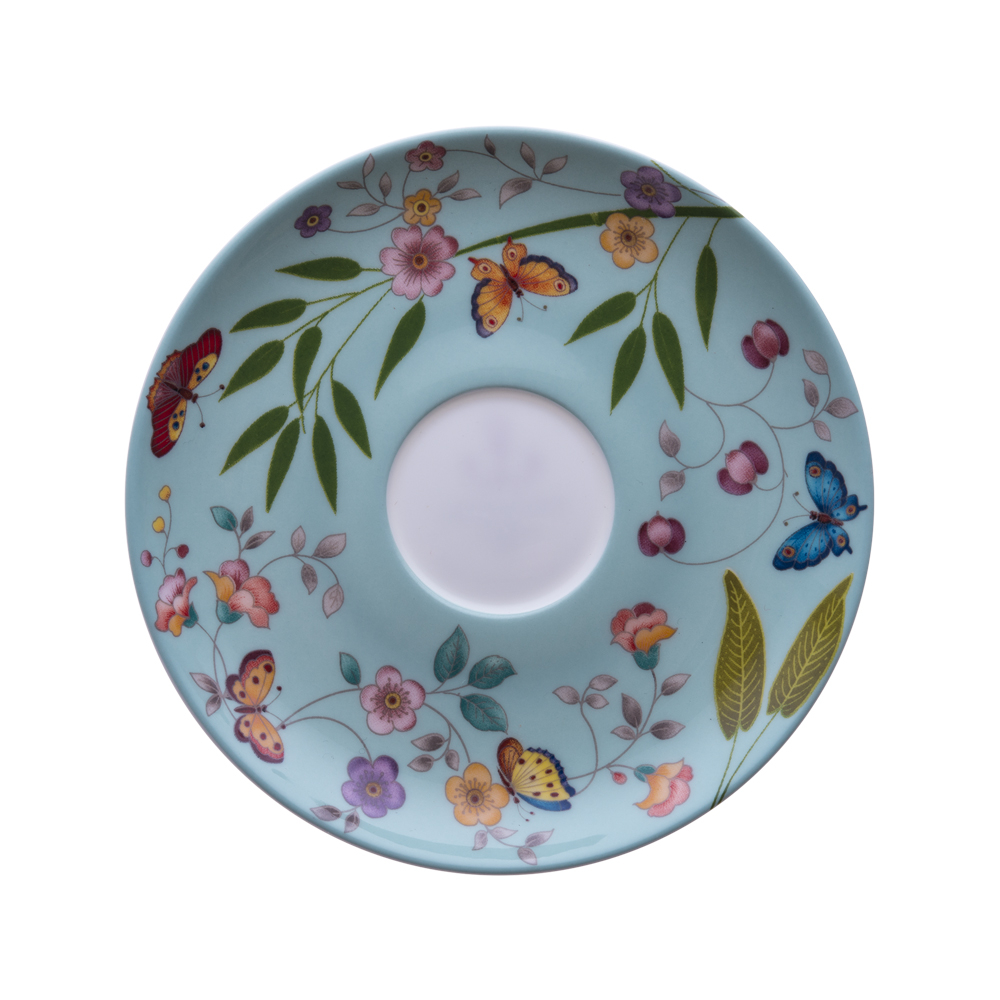 Il piattino per tazza caffè da 12,5 cm, in raffinata bone china, riprende il decoro arioso della collezione: piccoli fiori, foglie e farfalle animano la superficie azzurra, coordinandosi in modo perfetto con la tazzina dedicata. Ideale come supporto per il servizio caffè elegante e armonico, offre un accento gioioso e naturale a ogni coffee break.