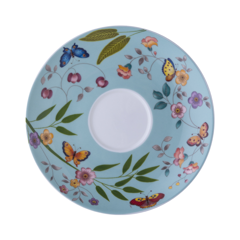 Il piattino da 15 cm per tazza tè o cappuccino, in pregiata bone china, ripropone fedelmente il decoro floreale con rami, fiori e farfalle della collezione. Ogni dettaglio sottolinea la leggerezza della stagione primaverile e dona alla mise en place un tocco di gioia spontanea, ideale per momenti conviviali o un raffinato afternoon tea.