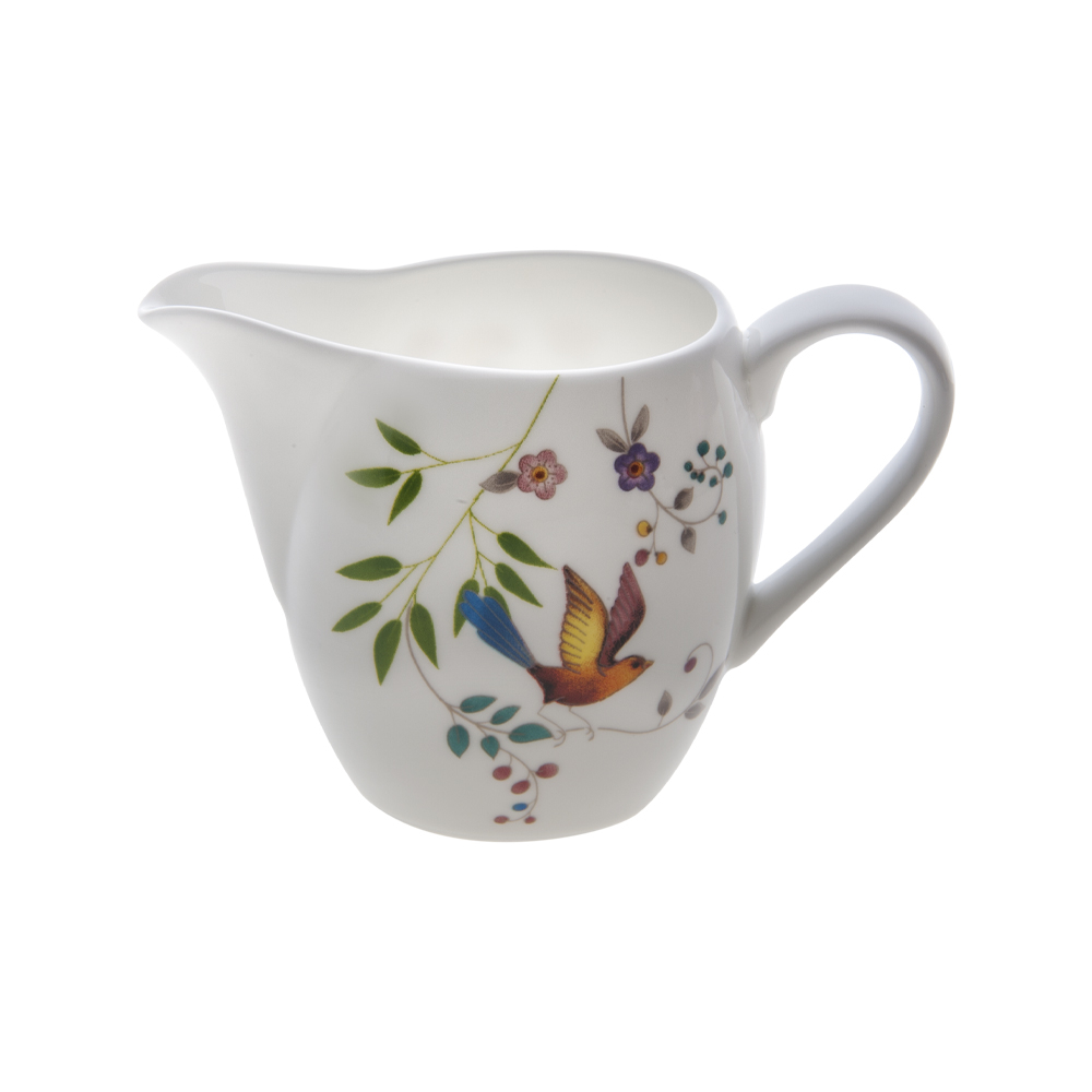 La lattiera da 150 cc della collezione Incanto di Primavera completa il servizio tavola con la sua forma raffinata in bone china e il decoro armonioso di fiori, foglie e graziosi uccellini. Questo accessorio aggiunge dolcezza e freschezza a colazioni, tè e caffè, evocando in ogni particolare la gioia e la vitalità proprie della stagione primaverile.