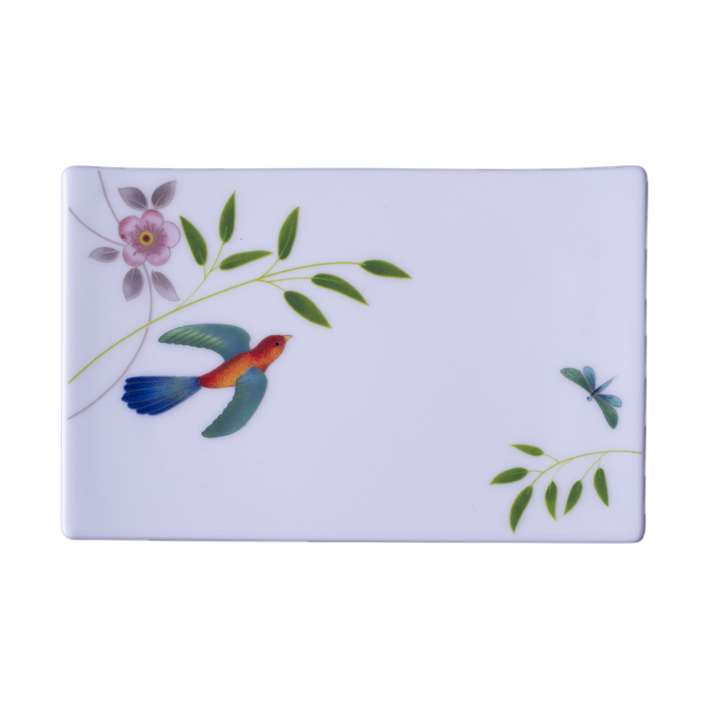 Il vassoio rettangolare da 15 cm della collezione Incanto di Primavera unisce praticità e grazia naturale. Realizzato in bone china bianca, è impreziosito sul bordo da un decoro di fiori, foglie e uccelli dai toni leggeri. Ideale per servire dolcetti, biscottini o piccoli snack, trasforma ogni pausa in un momento di serenità e poesia botanica.