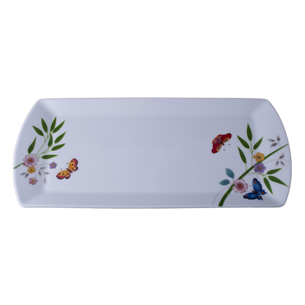 Questo vassoio rettangolare da 35 cm, in pregiata bone china, offre una superficie ampia ornata da un intreccio di rami fioriti, foglie verdi e farfalle colorate. Pensato per portate condivise, buffet o presentazioni scenografiche, porta sulla tavola la magia della primavera, valorizzando ogni composizione con un tocco raffinato e naturale.