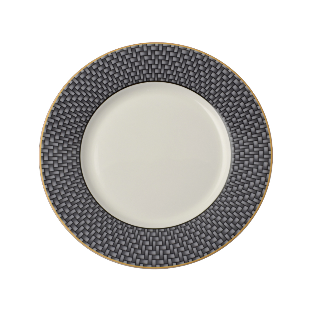 Il piattino pane e burro da 17,5 cm della collezione Intrecci nella variante nera è realizzato in preziosa bone china bianca, arricchita da un intenso decoro a trama geometrica intrecciata in nero lucido. Il motivo, ispirato all'antica arte della tessitura, si sviluppa con eleganza e simmetria, donando dinamicità a ogni mise en place. Perfetto per accompagnare pane, piccoli assaggi o amuse-bouche, trasforma la tavola in un racconto di artigianato e design contemporaneo.