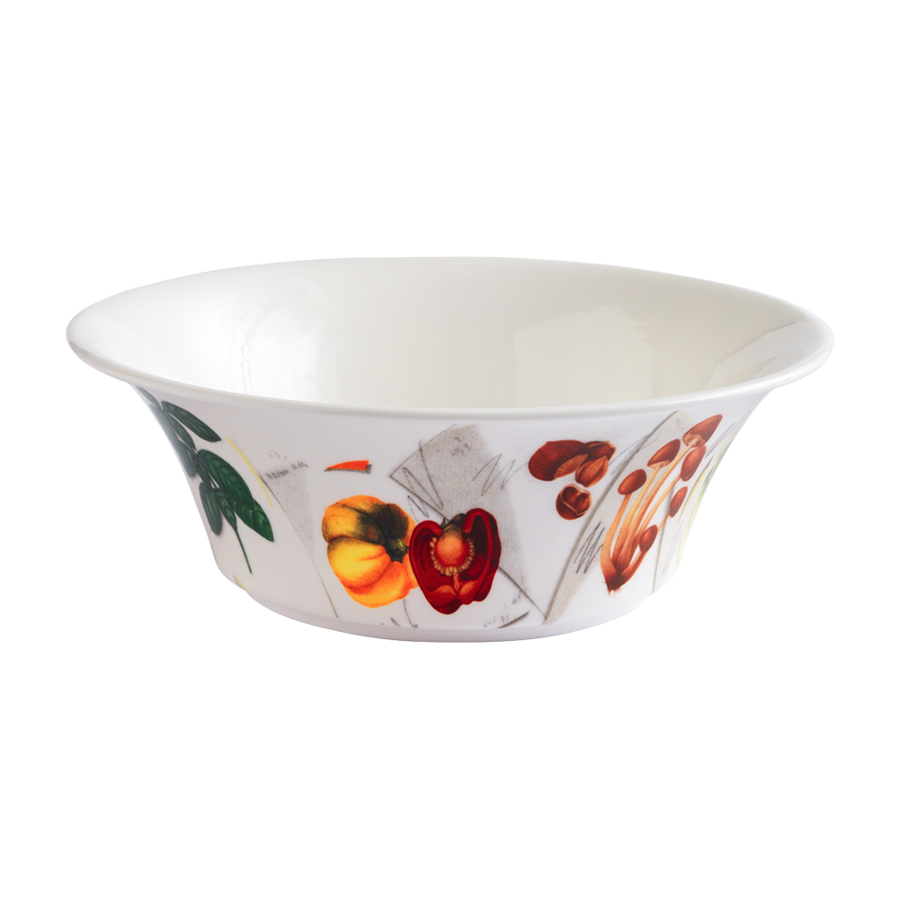 L'insalatiera da 24 cm in bone china, linea Vegan, mette in scena sulla parete esterna un vero collage illustrato di ispirazione editoriale: basilico, peperoni, noci e funghetti, con dettagli di appunti scritti, scarabocchi, effetti pennarello, segni a matita e numeri tipografici, tipici della storica rivista. Il bianco interno ne esalta la pulizia formale; l'effetto è giovane, pop e vivace, perfetto per insalate, macedonie o contorni che vogliono la scena di una vera copertina!