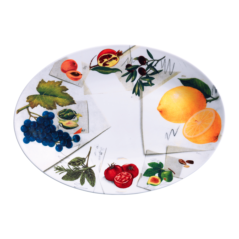 Il piatto ovale da 37 cm della linea Vegan trasforma il servizio centrale in un'esplosione creativa: la vasta superficie in bone china è decorata sul bordo da una sequenza di frutta, ortaggi e verdure disegnate ?a mano?, tocchi di colore e note editoriali simili a post-it o comandi della redazione, tutto in perfetto stile collage anni '80-'90. Il centro resta prevalentemente bianco per offrire uno sfondo pulito ai piatti condivisi o buffet, mentre il bordo rimanda immediatamente al mondo visivo di La Cucina Italiana più giocosa.