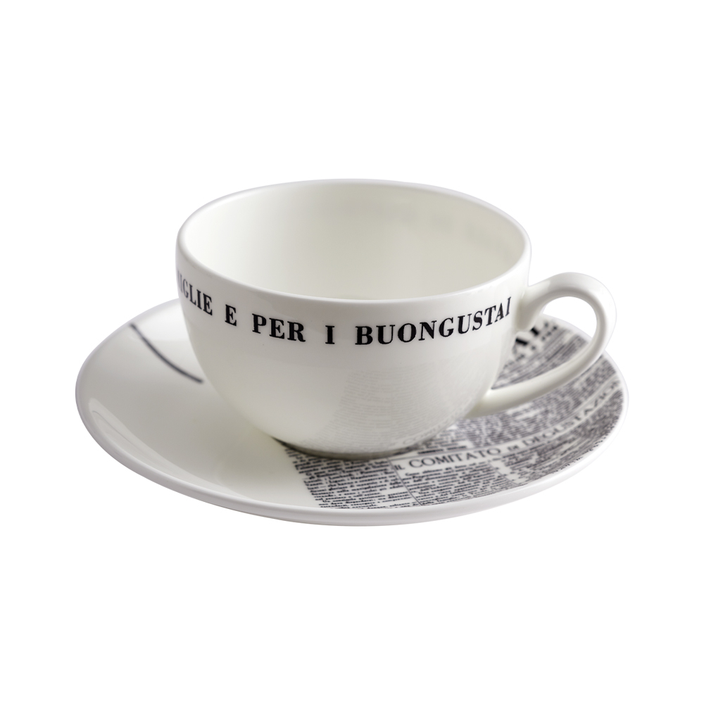 La tazza tè/cappuccino con piattino, nella linea Geometric, unisce la morbidezza della forma in bone china con dettagli black&white: si notano i decori con la scritta ?La Cucina Italiana? e motivi geometrici e tipografici neri ispirati al primo numero della rivista del 1929. Sul piattino si trova una fascia con veri estratti di testo storico e dettagli grafici originali. L'effetto è di rigore e cultura, una citazione discreta della tipografia modernista della prima La Cucina Italiana.