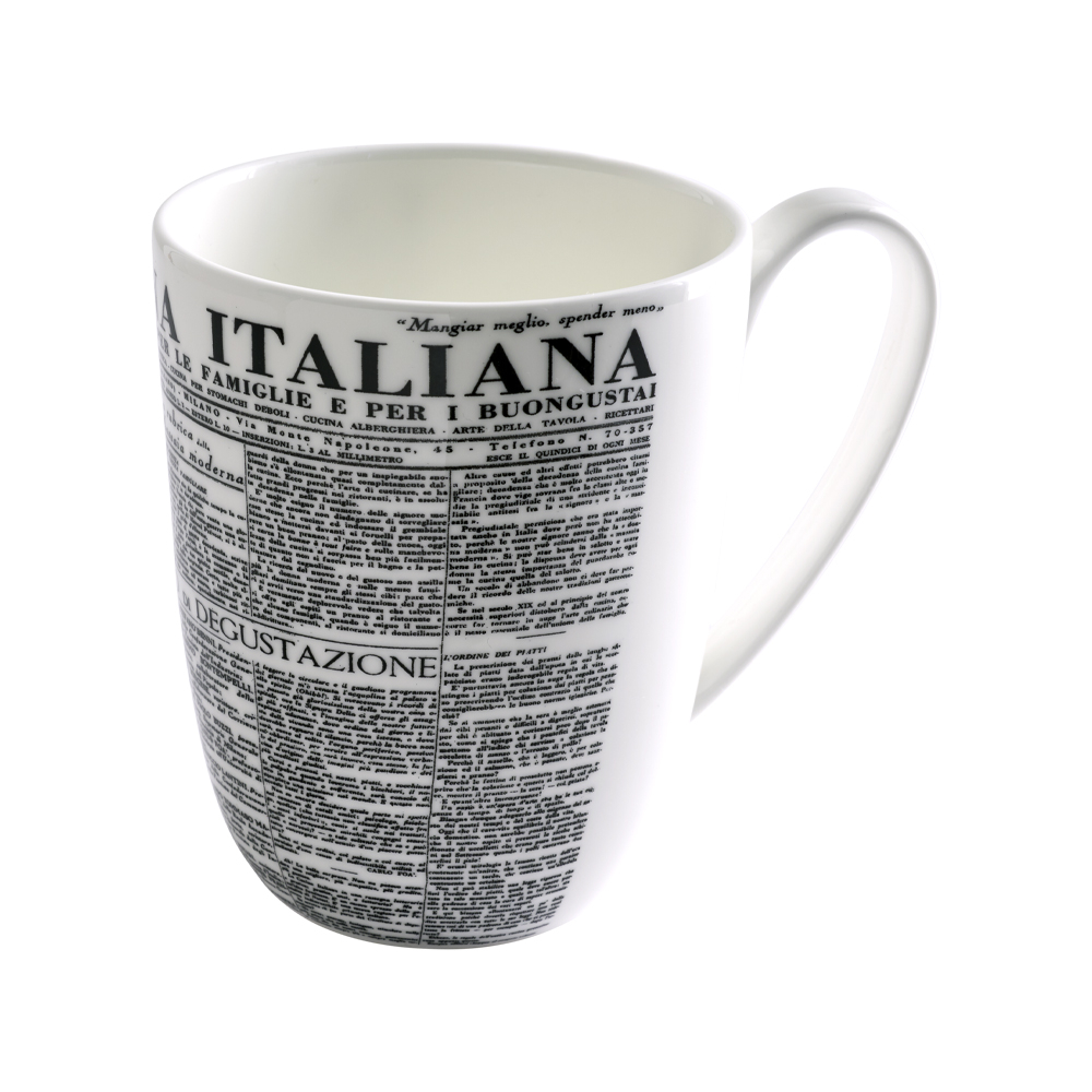 Mug in bone china bianca decorata della linea Geometric con motivi geometrici neri ispirati alla copertina e ai dettagli tipografici del primo numero di ?La Cucina Italiana? (1929). Sulla superficie esterna compaiono linee nere orizzontali e verticali, blocchi astratti e fasce con veri estratti di testo: tra questi si ritrovano scritte storiche come ?La Cucina Italiana? e parte dell'elenco originale del Comitato di Degustazione. Il design, pulito e rigoroso, fonde stile minimal contemporaneo e grafica d'archivio editoriale, per una mug unica e iconica che celebra la storia della gastronomia e del design italiano