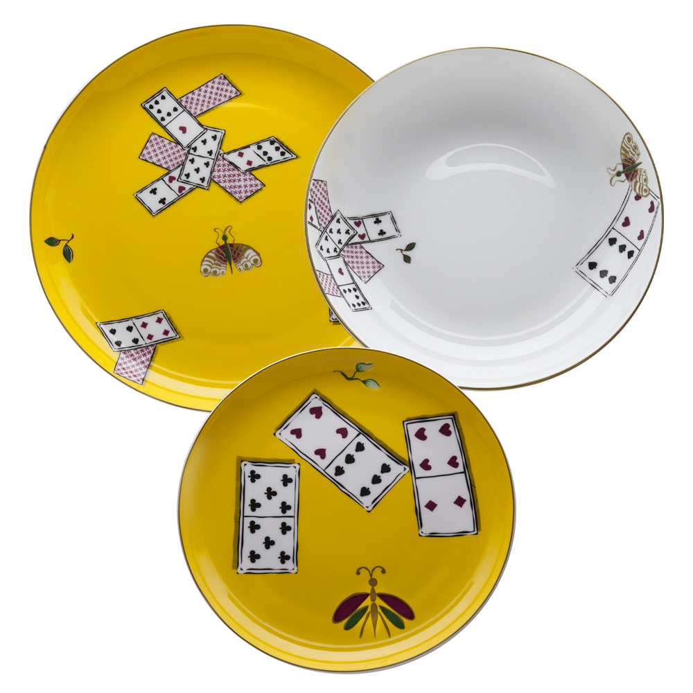 Il set 3 pezzi in Giftbox Carte da Zogo è un autentico omaggio al brillante eclettismo veneziano del Settecento, pensato per chi desidera una tavola che racconti subito una storia. Ogni piatto (piano, fondo e dessert) è realizzato in bone china e decorato con un fondo giallo e bianco intenso, vivacemente arricchito da carte da gioco a semi rossi e neri. Tra questi simboli di intrigo e socialità si muovono farfalle multicolori, allegre e raffinate, e piccole foglie verdi, che aggiungono fantasiosa leggerezza alla composizione. Un set che illumina ogni occasione conviviale con spirito giocoso, originalità e tradizione veneziana autentica.