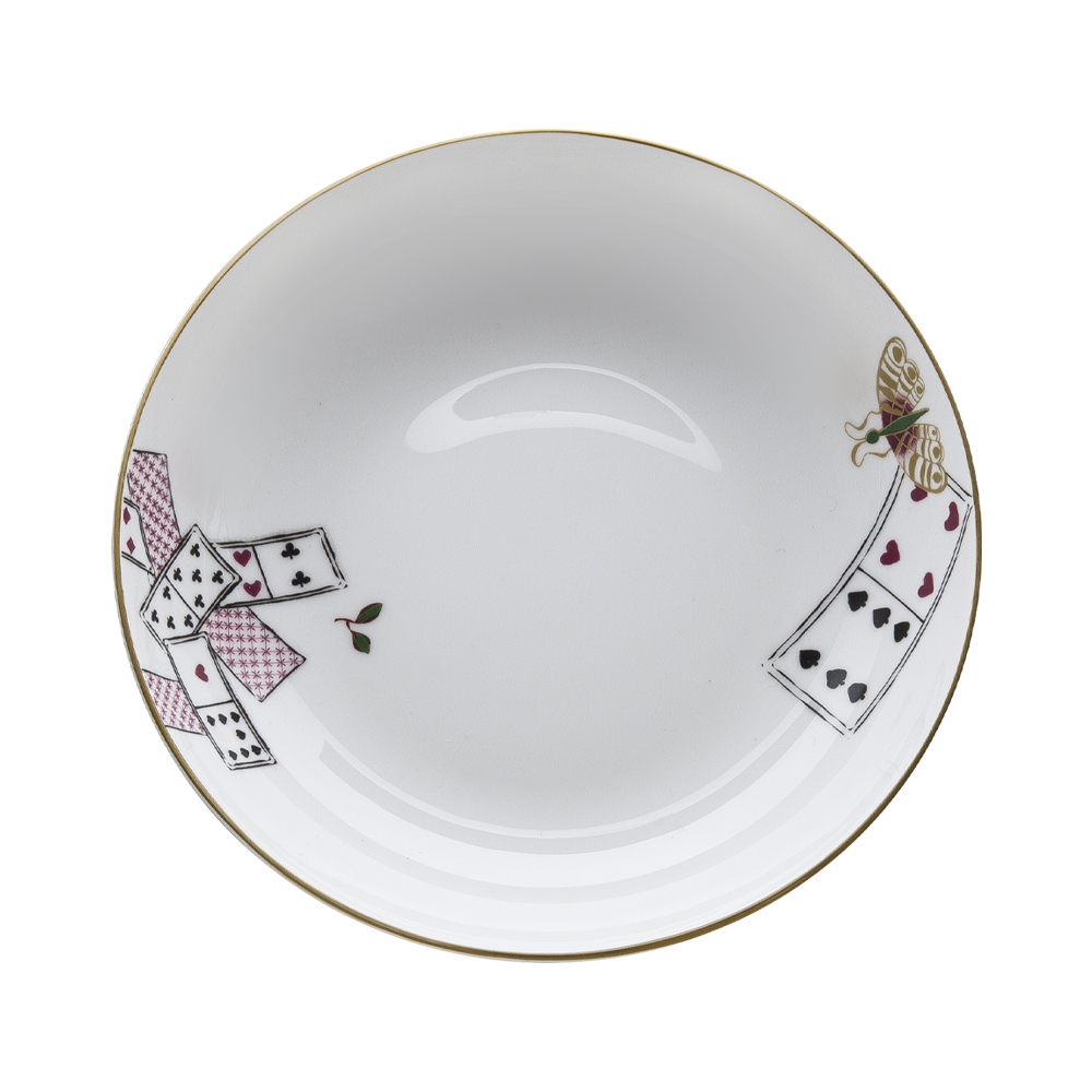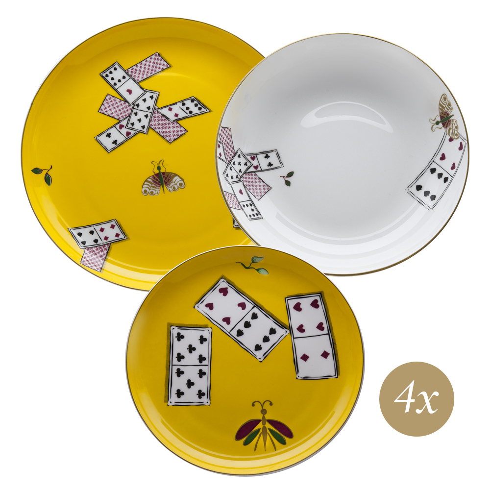 Il set 12 pezzi Carte da Zogo incarna la teatralità eclettica e giocosa della Venezia settecentesca, reinterpretando la vita salottiera attraverso il design e la decorazione. Ogni piatto del servizio, in bone china, è caratterizzato dall'intenso fondo giallo e bianco, su cui emergono le iconiche carte da gioco a semi rossi e neri, vivacemente distribuite sulla superficie. Tra le carte si animano farfalle colorate e leggere, simbolo di fantasia e spirito libero, e raffinati motivi di foglie verdi che introducono una nota naturale e sofisticata. Questo set è pensato per chi desidera rendere ogni tavola un racconto di convivialità, arte e storia, illuminata dalla luce ironica e mondana della tradizione veneziana.