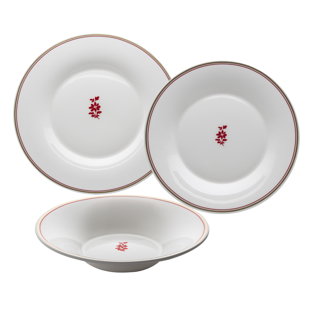 Il set tavola 3 pezzi Feston e Cadena Rosso comprende piatto piano, fondo e dessert, tutti in bone china con decoro oro zecchino e rosso con glicine. Una soluzione completa per vivere la raffinatezza veneziana ogni giorno: i dettagli, ispirati alle conversazioni dei caffè storici, trasformano la mise en place in una dichiarazione di stile. Un servizio perfetto per arricchire la tavola con un gesto contemporaneo e di classe, firmato Geminiano Cozzi 1765.