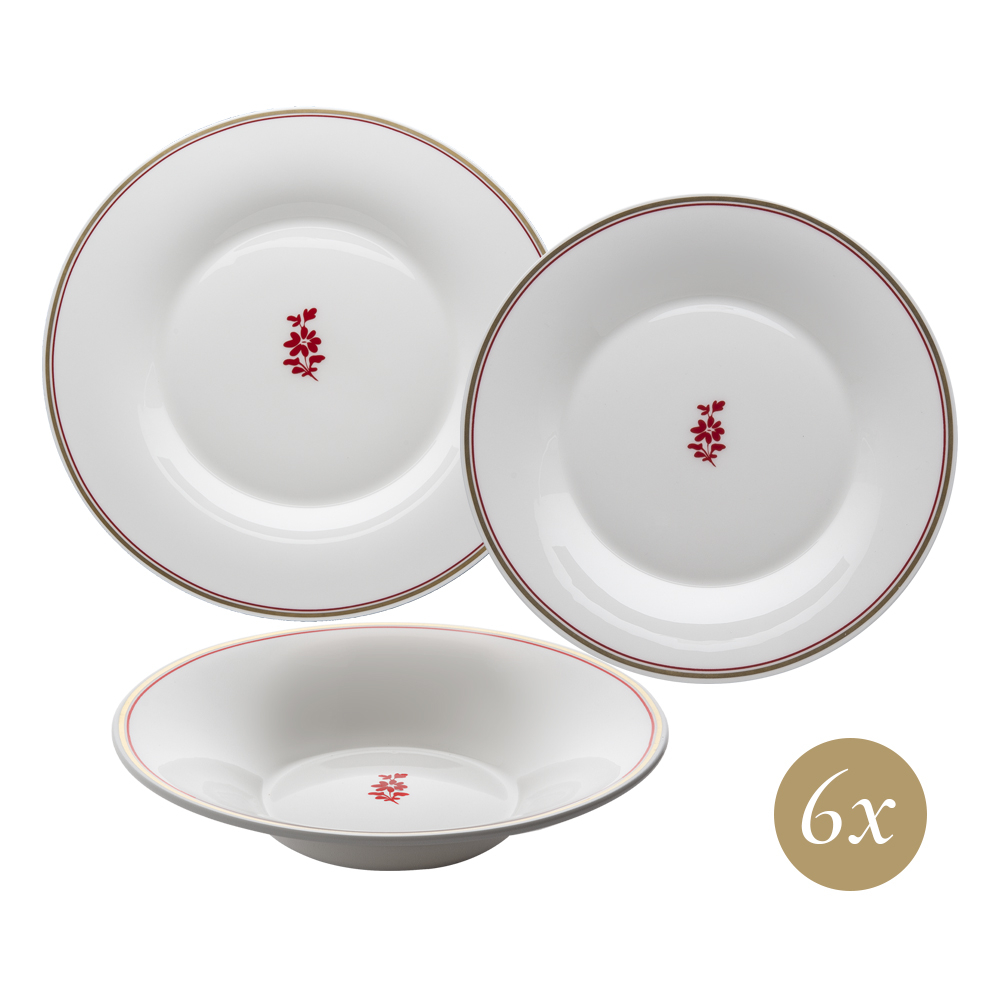 Il set 18 pezzi Feston e Cadena Rosso propone una mise en place completa con piatti piani, fondi e dessert in pregiata bone china. Ogni elemento è decorato da un elegante filo in oro zecchino, arricchito dal controfilo rosso e da un delicato fiore centrale, per una tavola raffinata e armoniosa. Firmato Geminiano Cozzi 1765, questo servizio trasforma ogni occasione conviviale in un'esperienza di eleganza senza tempo.