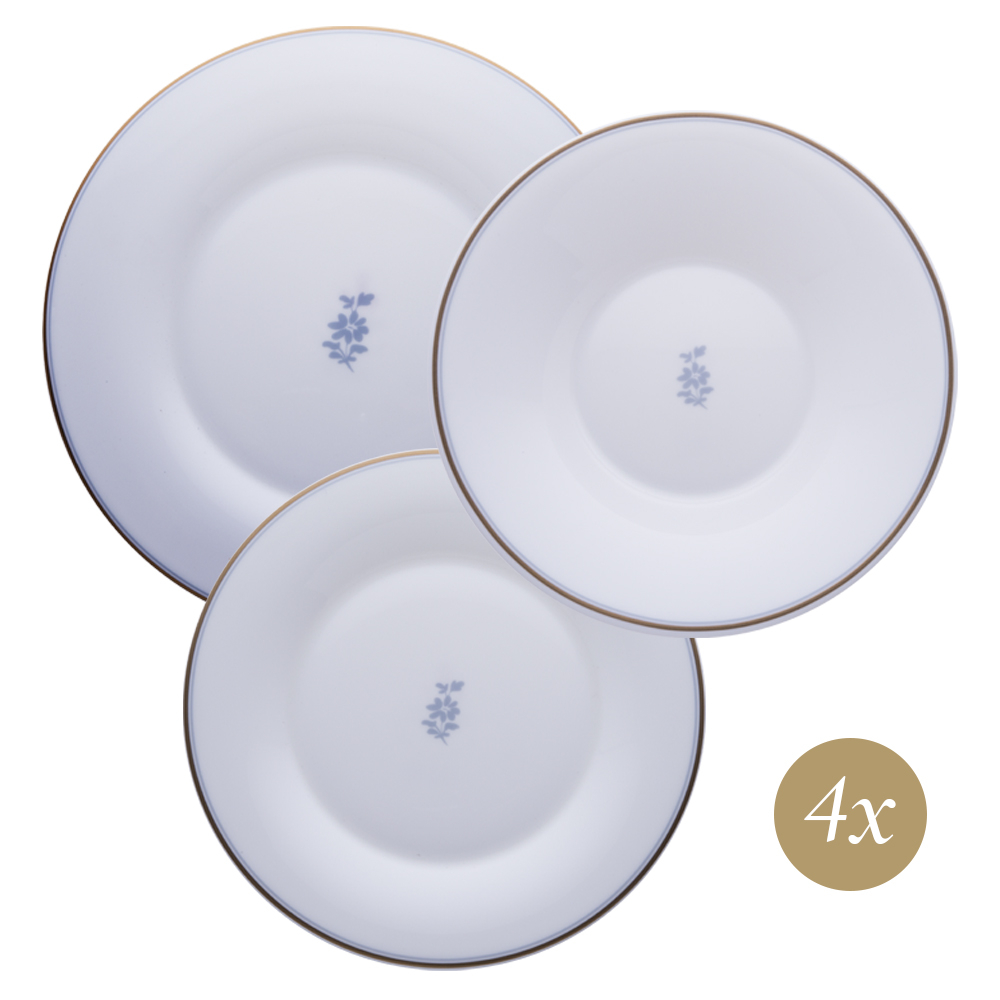 Il set 12 pezzi Feston e Cadena Azzurro offre una tavola da sogno: piatti piani, fondi e dessert realizzati in bone china, decorati da bordi alternati in oro zecchino e glicine blu. La cura artigianale e il decoro iconico regalano uno stile luminoso, ideale per grandi convivialità in perfetta armonia veneziana Geminiano Cozzi 1765.