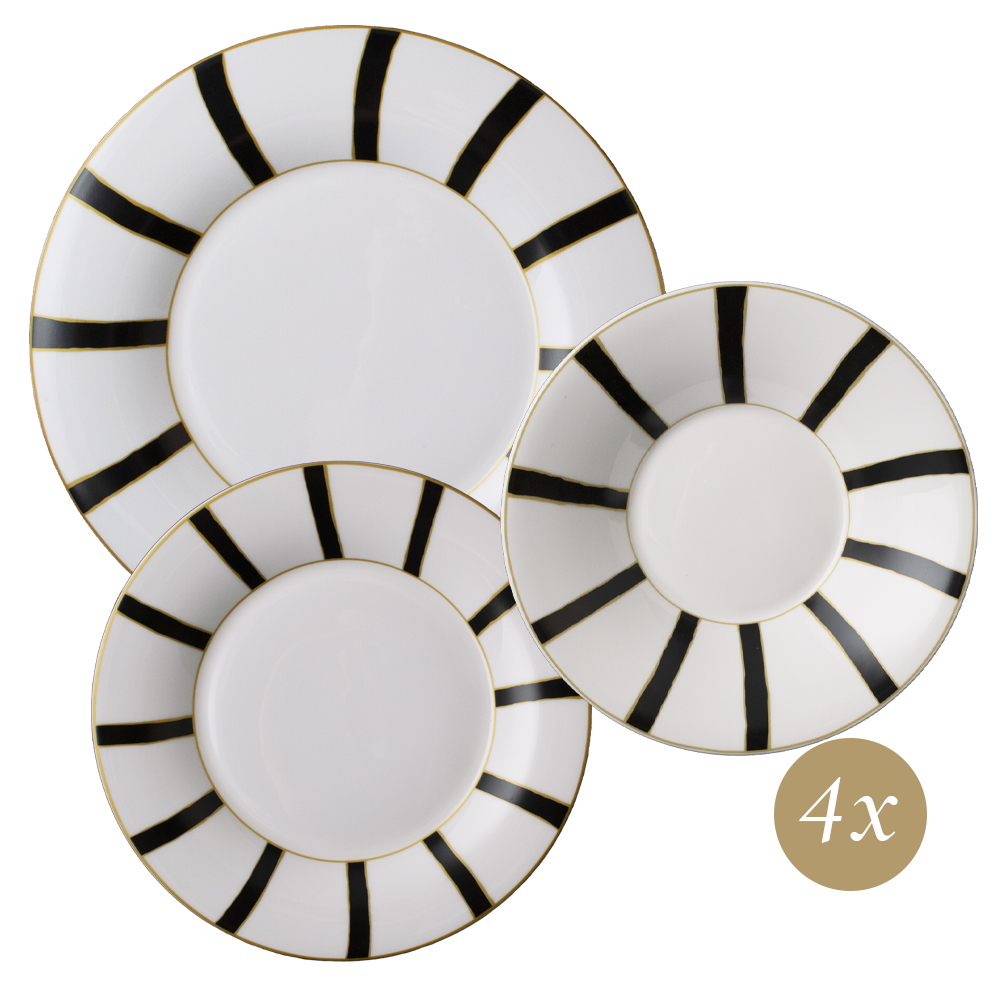 Il set 12 pezzi Striche Nere e Oro incarna il massimo della coerenza e del prestigio per la tavola. Composto da piatti piani, fondi e dessert in autentica bone china, ogni elemento presenta il caratteristico motivo radiale: fasce nere si alternano accuratamente a spazi bianchi, delimitate da sottili profili dorati applicati con maestria artigianale. La scansione ritmica del decoro richiama la grande tradizione veneziana rivisitata in chiave moderna, offrendo unicità visiva e continuità stilistica. Pensato per mise en place scenografiche, famigliari o da rappresentanza, questo servizio trasforma ogni occasione in un'esperienza di autentica eleganza Geminiano Cozzi.